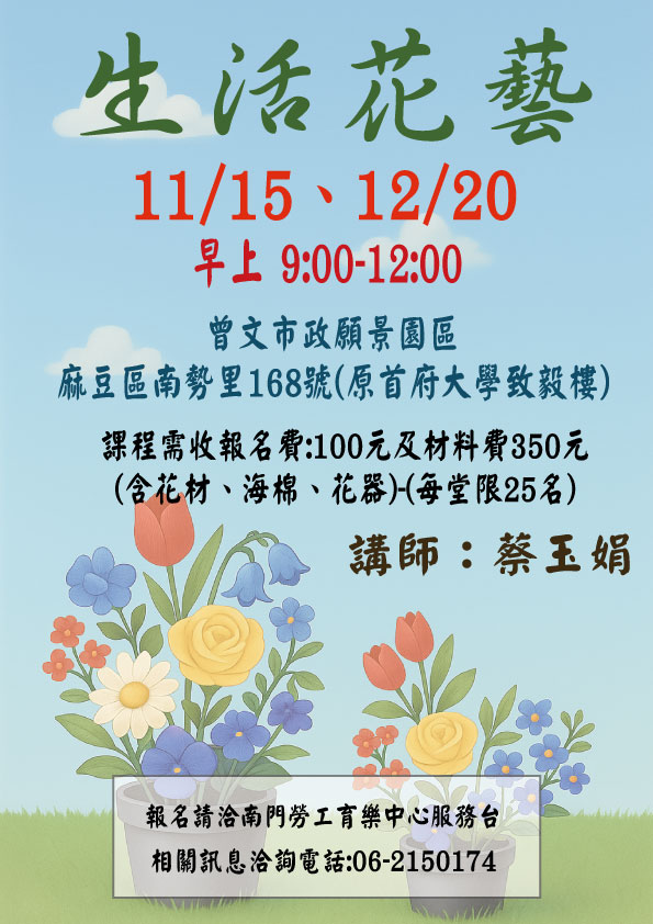 每堂名額限25名,並酌收報名費100元及教材費350元(含花材、海棉、花器)